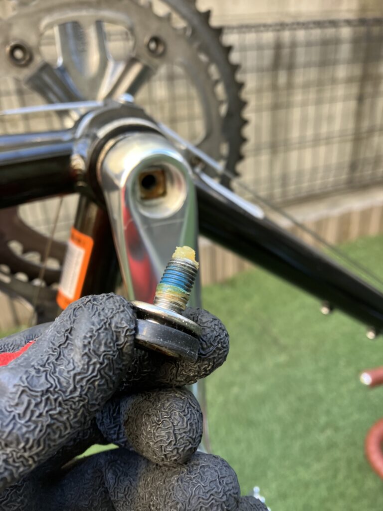 ボルトを外したら、コッタレス抜きのネジ部分(外側の太いネジ)を、 クランクの中心のネジ穴にしっかり奥までねじ込みます。